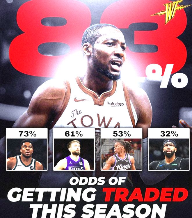 随着交易截止日的临近,各队的交易动向逐渐清晰,本赛季各球员被交易的概率榜单也随之曝光。榜单显示,勇士球员乔纳森·库明加以83%的概率位居第一,雄鹿球星扬尼斯·阿德托昆博以73%紧随其后,国王中锋多曼塔斯·萨博尼斯(61%)、国王后卫基翁·埃利斯(53%)以及前文提及的安东尼·戴维斯(32%)分别位列第三至第五位。
